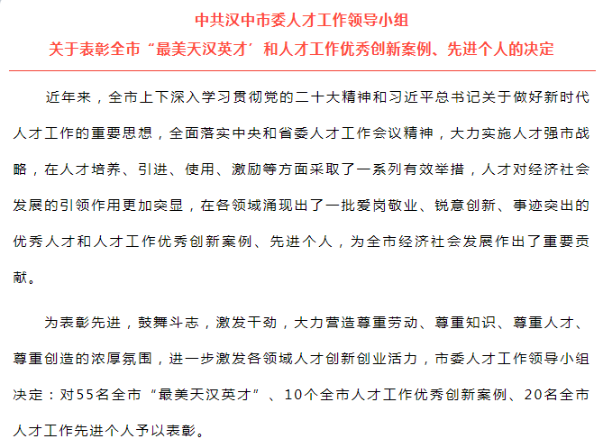 此次評(píng)選根據(jù)《中共漢中市委組織部關(guān)于開展全市“最美天漢英才”和人才工作優(yōu)秀創(chuàng)新案例、先進(jìn)個(gè)人評(píng)選工作的通知》精神,經(jīng)逐級(jí)遴選和嚴(yán)格審核把關(guān)。